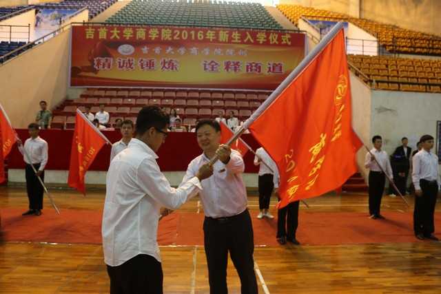 在授班旗仪式上,院党委书记黎克双在庄严的校歌声中为新增加的16个班级授予了班旗。鲜红的班旗在旗手手中挥舞,令在场的所有新生激动不已,仪式气氛达到高潮。相信我们所有的同学,定能在班旗的引领下,秉承"精诚锤炼、诠释商道"的院训,团结一致、奋发图强、努力拼搏,成为一名社会主义事业合格建设者和可靠接班人。