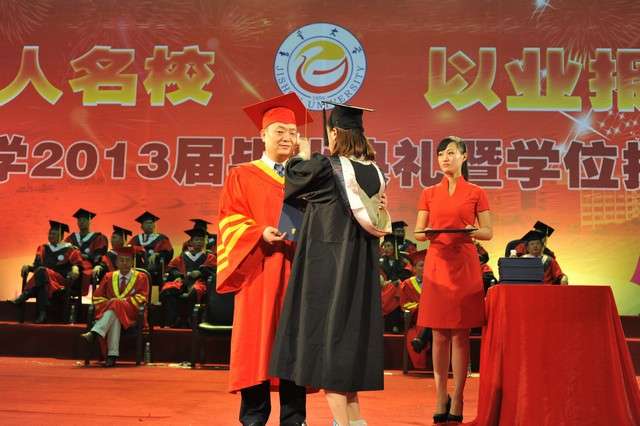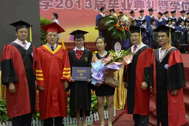 6月8日下午,万象城官网在砂子坳校区体育馆举行了2013届毕业典礼暨学位授予仪式。万象城官网874名学士、41名硕士依次踏上象征着成功与喜悦的红地毯,由校学位评定委员会主席、校长肖湘愚教授亲自为每个学生颁发学位证并合影留念。