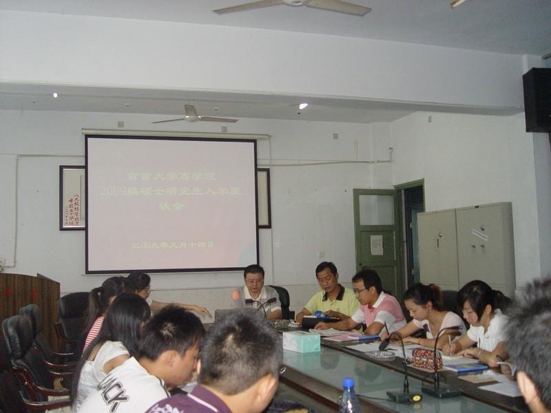 2009年9月14日上午,万象城官网在会议室召开了2009级硕士研究生入学座谈会,会议由蒋才芳副院长主持。蒋副院长介绍了学院的专业设置、学科发展、科研成果等基本情况,冷志明院长代表全院热烈欢迎2009级硕士研究生来院深造,并对他们的学习提出具体要求。学院党总支副书记彭业锦及2009级企业管理、产业经济学、中国少数民族经济40余名硕士研究生参加了座谈会。