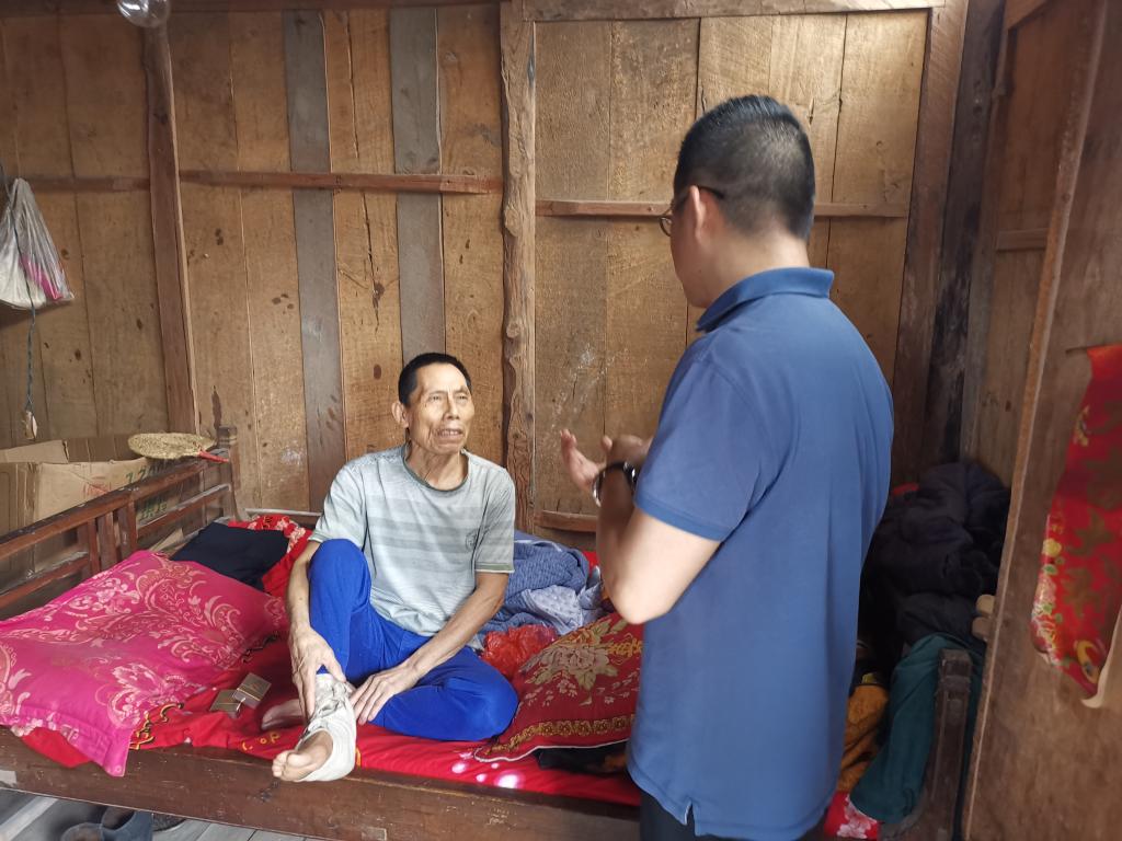 在丁建军院长的结对帮扶户胡世保家中,看到其父亲因做工不慎摔伤脚一直躺在床上行动不便,大家到床前关切地询问了其伤情,并就后续治疗、医保报销等实际问题向其进行了政策宣传。
