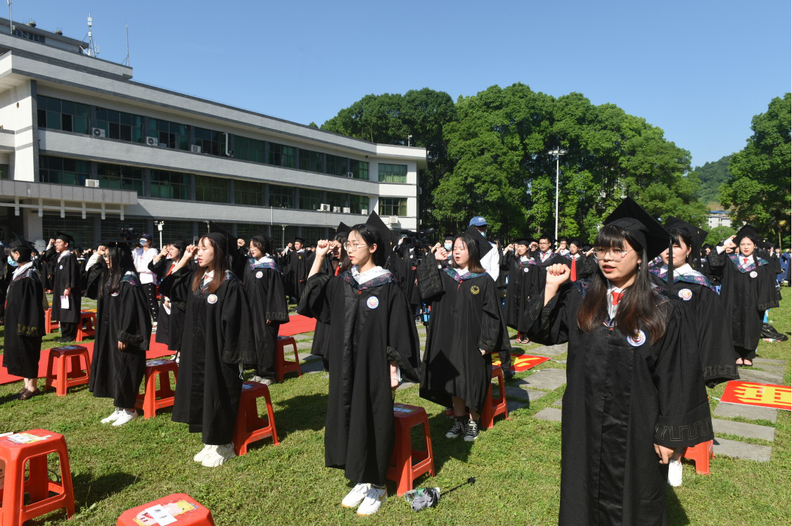 在诵读毕业誓词环节,学院2021届全体毕业生在毕业研究生代表邱晔的带领下,高举右拳,集体诵读《awc777万象城娱乐官网毕业誓词》。